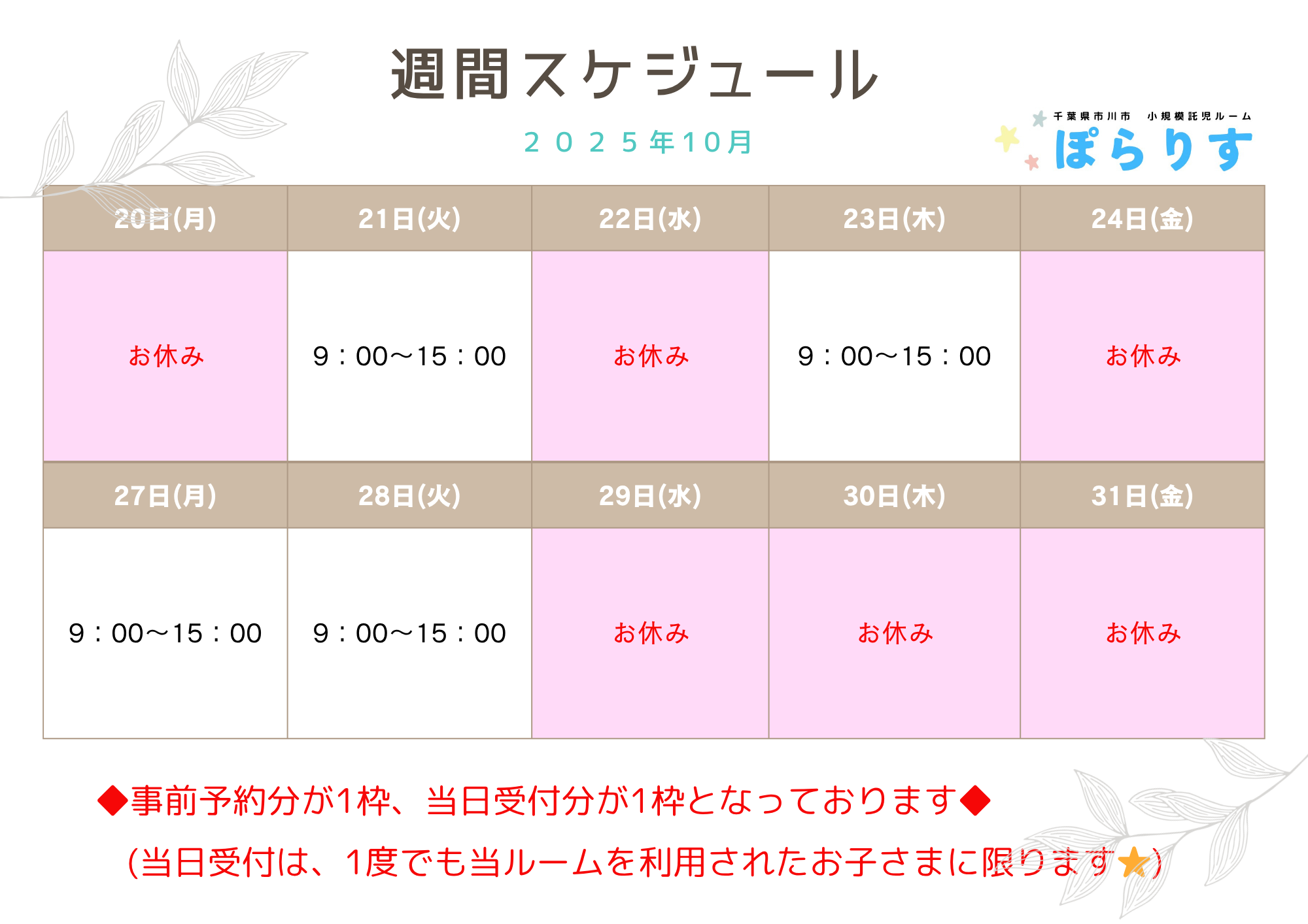 【市川市小規模託児ルーム ぽらりすからのお知らせ】10月4週目〜最終週の営業時間のご案内🌼