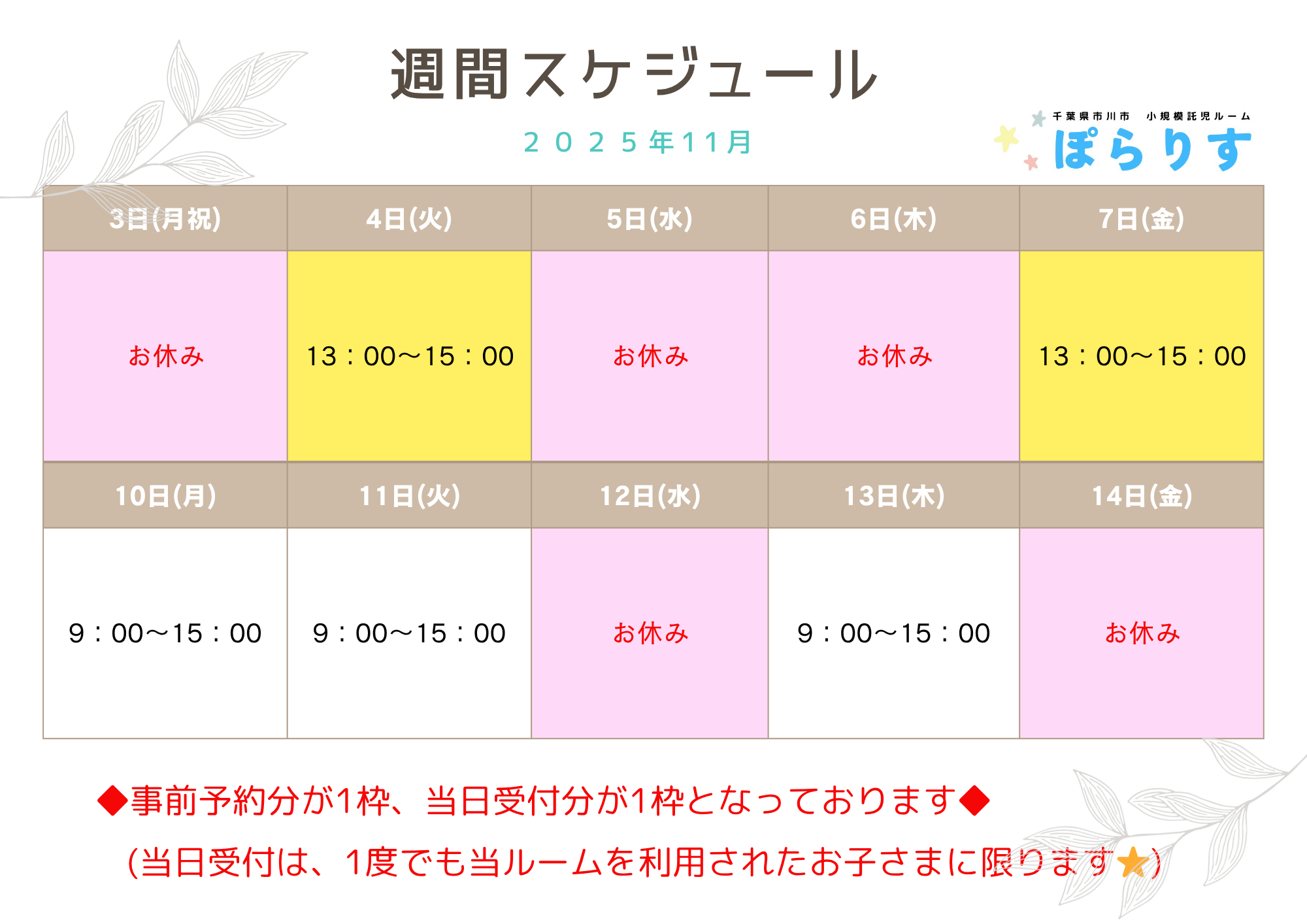 【市川市小規模託児ルーム ぽらりすからのお知らせ】11月2〜3週目の営業時間のご案内🌼