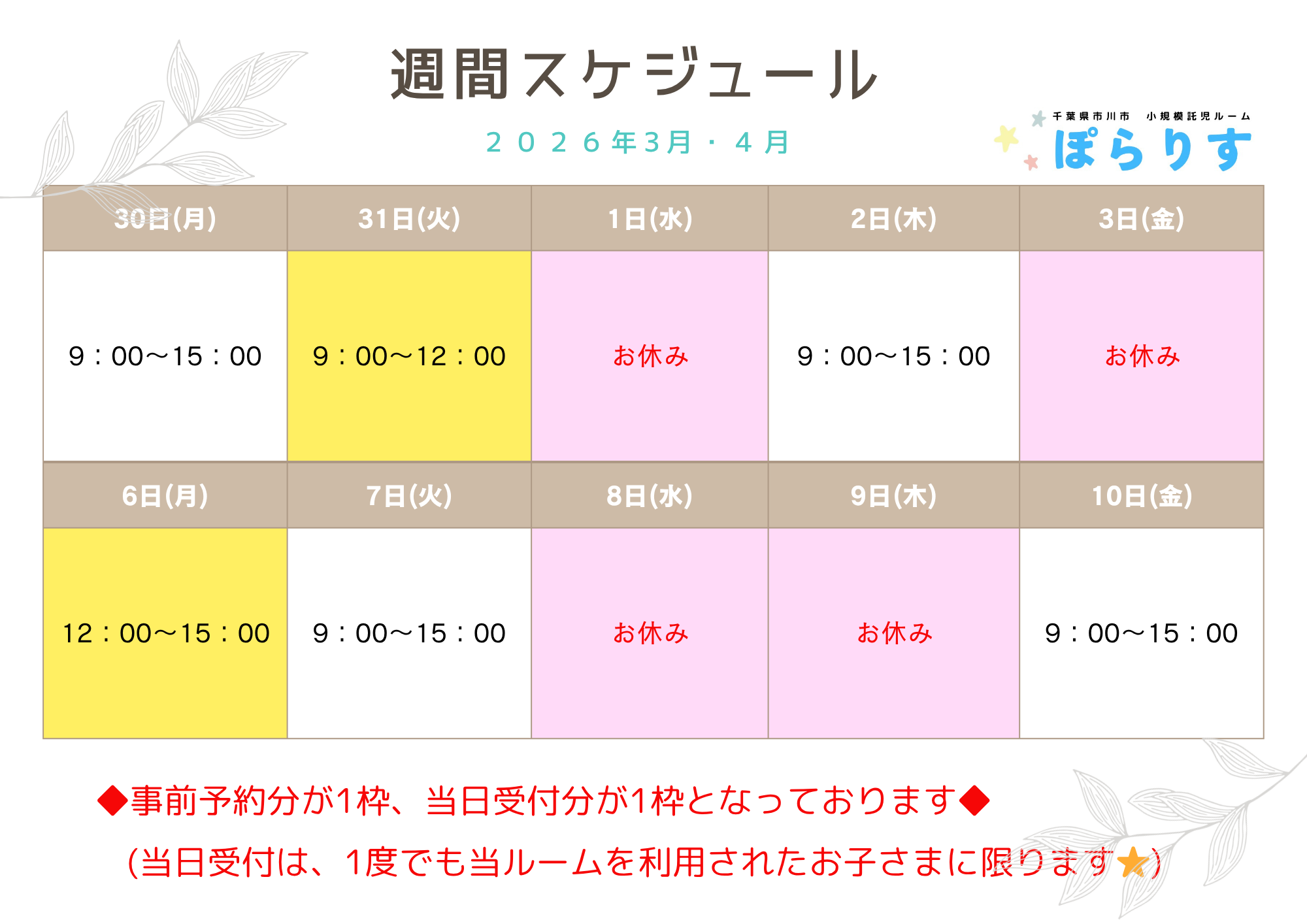 【市川市小規模託児ルーム ぽらりすからのお知らせ】3月最終週〜4月2週目の営業時間のご案内🌼