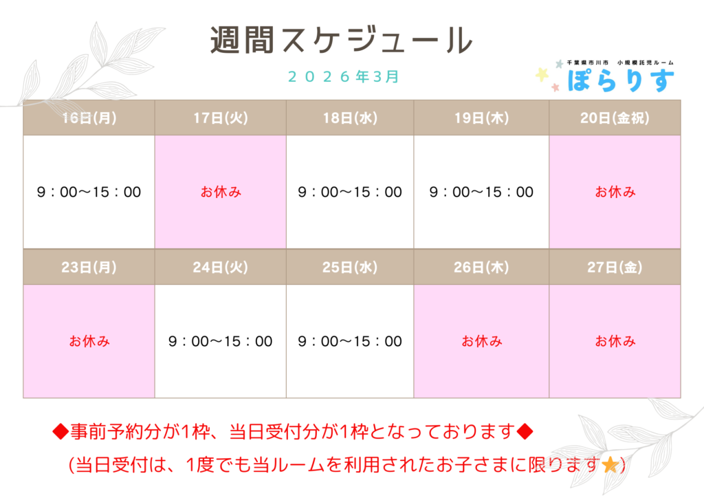 【市川市小規模託児ルーム ぽらりすからのお知らせ】3月3〜4週目の営業時間のご案内🌼