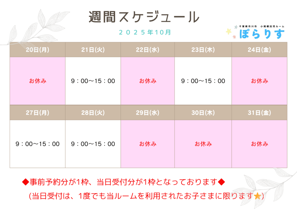 【市川市小規模託児ルーム ぽらりすからのお知らせ】10月4週目〜最終週の営業時間のご案内🌼こんにちは⭐️ 10月4週目〜2週間分の予定です🗓️ 今週1週間分の更新がなく申し訳ありませんでした。そんな中でも、たくさんお問い合わせいただきありがとうございます☺️ 10月もあと半分ですね💦気温もど...