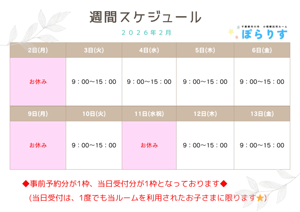 【市川市小規模託児ルーム ぽらりすからのお知らせ】2月1〜2週目の営業時間のご案内🌼